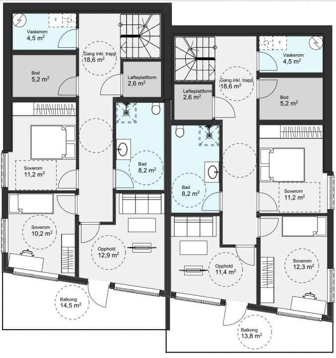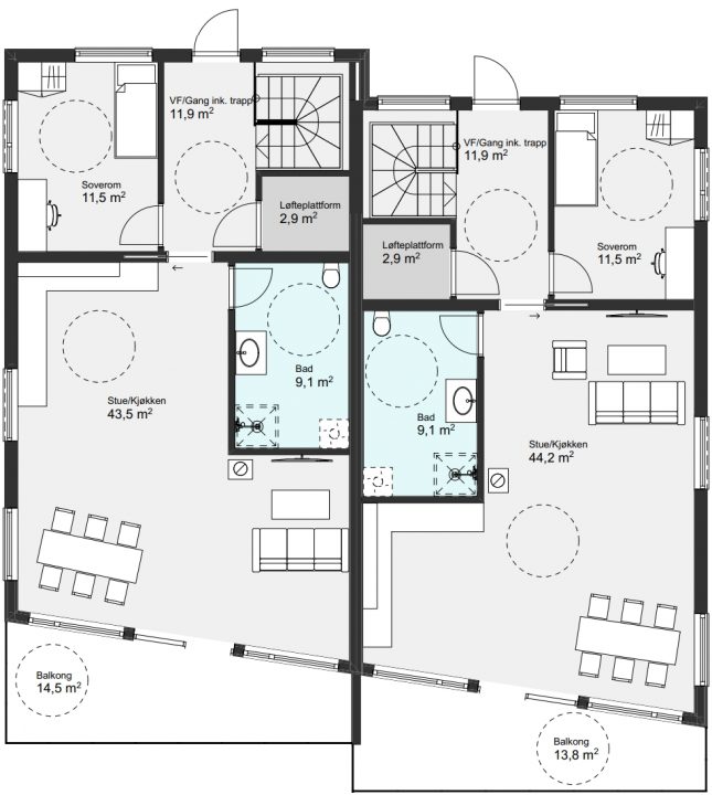 Bolig 1104 er en tomannsbolig litt utenom det vanlige. Materialene har blir satt sammen for å skape en spennende fasade. Boligen er beregnet for skrå utsiktstomter og enhetene har blant annet en integrert romslig garasje. Fra kjøkkenet har man direktetilgang til terreng på ene siden av bygget, mens man fra soverom og stue har tilgang til terrasse.
