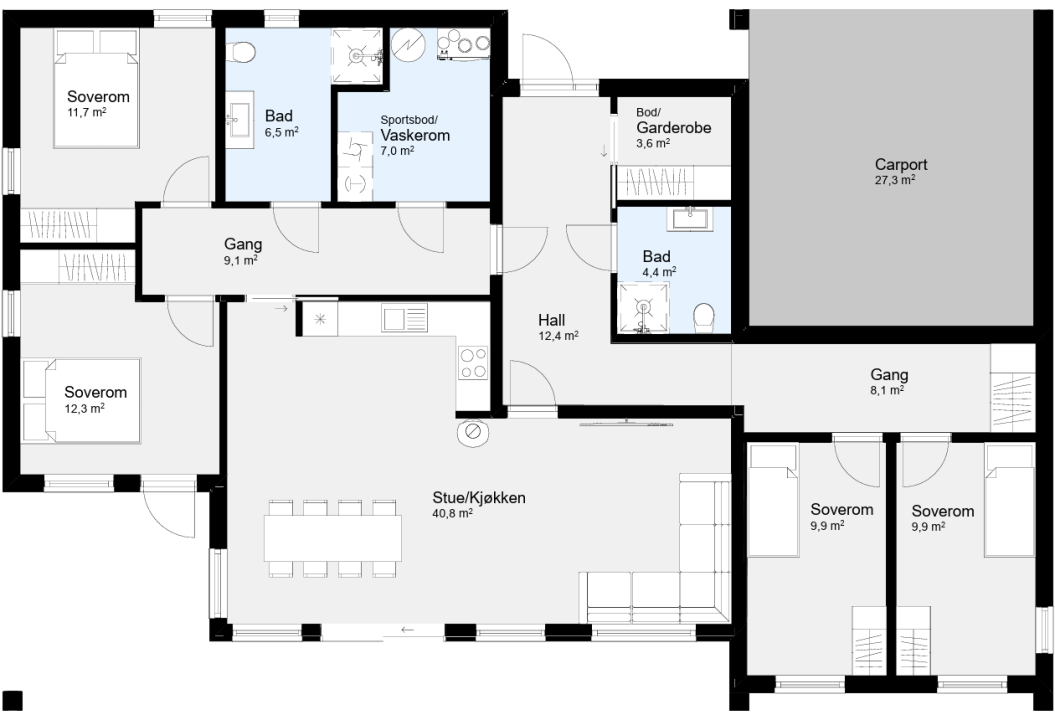Evo er en fleksibel boligmodell tilpasset ulike livsfaser. Du kan begynne i det små og utvide når behovene endrer seg – med Evo+ får du en romslig bolig på hele 144,7 m². Den åpne og funksjonelle planløsningen gir deg stor frihet til å sette sammen boligen slik du ønsker – med ekstra stue, soverom, kontor eller carport.